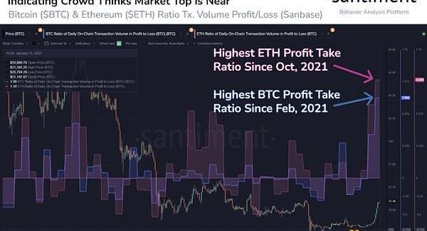 自1月初反弹以来,很多投资者希望“落袋为安”。根据Santiment分享的图表,比特币的获利回吐升至2021年2月的水平,而以太坊飙升至2021年10月的水平,2021年是加密牛市达到顶峰的一年,当时引发了大规模的获利回吐,这暗示投资者不太相信涨势会持续,可能会对当前正在经历的迷你牛市产生严重影响。