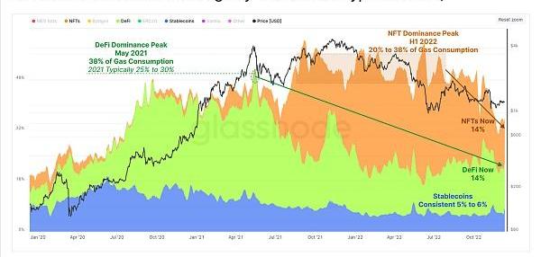 在类似的繁荣-萧条周期中,到2022年上半年,NFT相关交易占gas费用量的20%至38%,但现在也下降到14%。今年全年,稳定币一直保持着5%至6%的占比。
