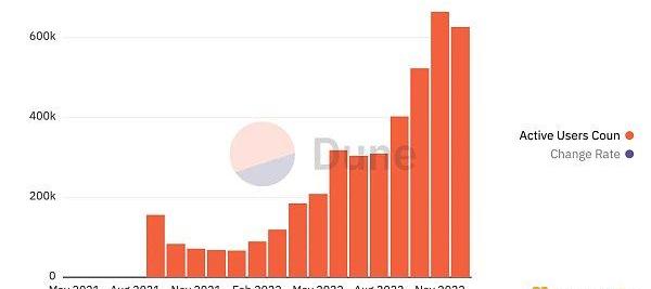 如前所述,受GMX等应用程序的使用以及Nitro可扩展性升级的推动,Arbitrum在2022年期间经历了活跃用户的强劲增长。L2的月平均活跃用户数从第一季度的9.18万激增至第四季度的605.0万,增幅达559.1%。