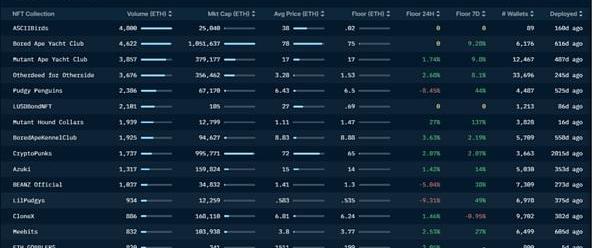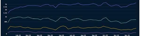 NFT市场总值近期出现缓慢增长,从活跃项目数来看,已连续四周时间出现稳步增长,越来越多的项目将发行NFT后发行Token做为项目标配,虽然此时行情冷淡,但在下一周期时可能会出现NFT先于Token出现增长的情况。从近期交易情况来看,出现一款ASCIIBirds,虽显示的交易极为活跃且交易量极大,但从主流交易市场来看,可能为项目方自刷行为,并未在Opensea上出现交易,另一款老牌蓝筹项目PudgyPenguins,在本周内出现交易量和交易笔数的双暴增,其地板价短期内增长一倍已达到6.5ETH。