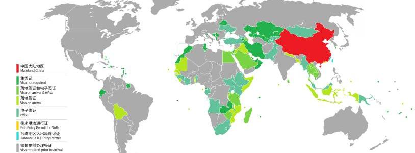 首先由于中国护照的特殊性,我们根据维基百科数据找到了下面这张图,它将为持中国普通护照的公民可以获得的签证分为了:1.免签证;2.落地签证和电子签证;3.落地签证;4.电子签证;5.往来港澳通行证;6.地区入初许可证;7.需要提前办理签证;8.拒绝入境。同时根据不同地区的情况,将其标上了对应的颜色。从图上可以直观地看到中国护照相对便捷的区域主要分布在东南亚、中东、东欧、东非和部分南美洲。对中国公民实施免签、落地签的国家或地区的详情可以参考中国移民管理局2019年发布的《45个国家或者地区对中国公民实施免签、落地签证政策》。
