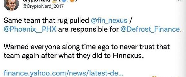 此外也有用户称,DefrostFinance?的项目方也是之前被盗的?Finnexus?和?PhoenixFinance?的同一个团队。这一信息真实性还有待考证,但也对用户提了个醒,尽量要选择实名的项目,匿名创始人背后,很有可能另有企图。