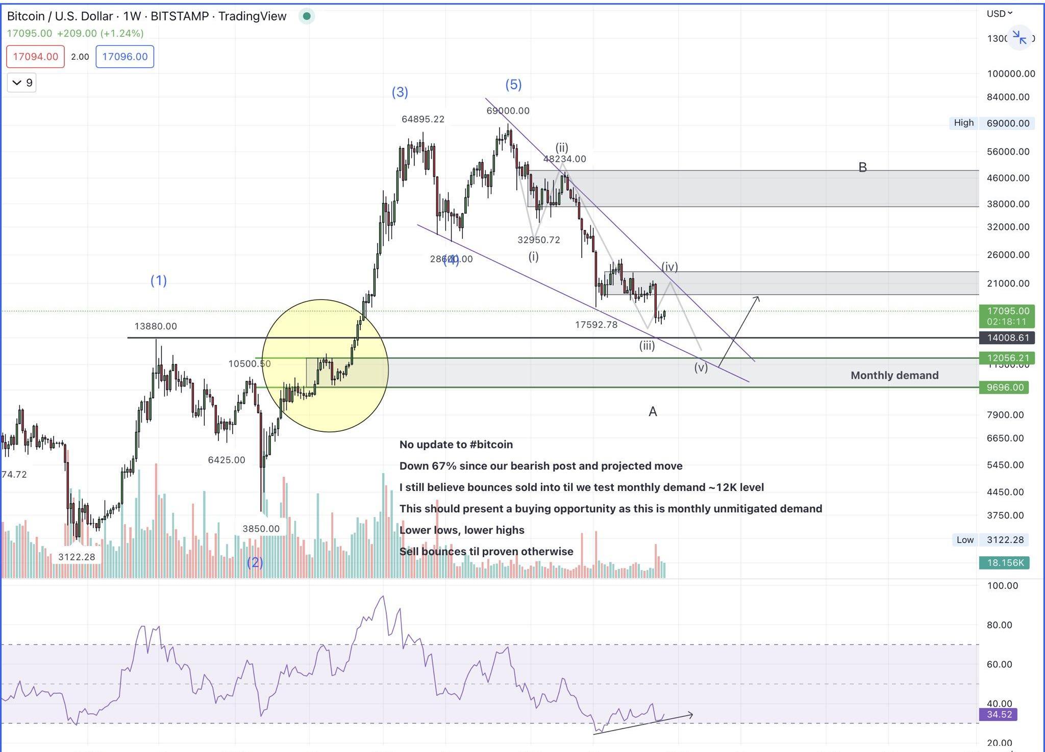 另一位人气交易员Bluntz在周线收盘后在推特上表示:“我现在仍然认为,BTC这次的上涨是修正abcw4的一部分,然后再创下15000美元以下的新低,进入2023年第一季度,在那里我们将找到一个长期的底部。”