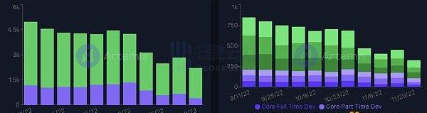 虽然Solana上的开发者人数仅次于Ethereum,但是根据Artemis数据显示,Solana上的开发者人数和开发进度近一两个月呈现出了下降的趋势。