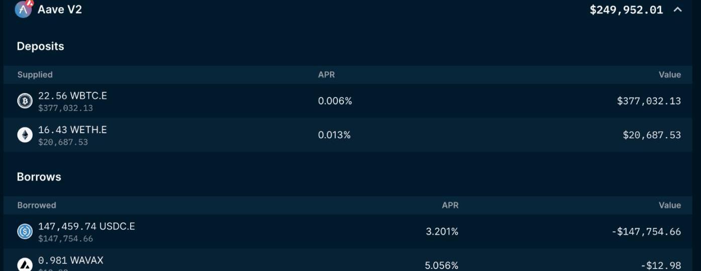 这些是Aave上的钱包和他们使用的矿池,总价值为49.7万美元:
