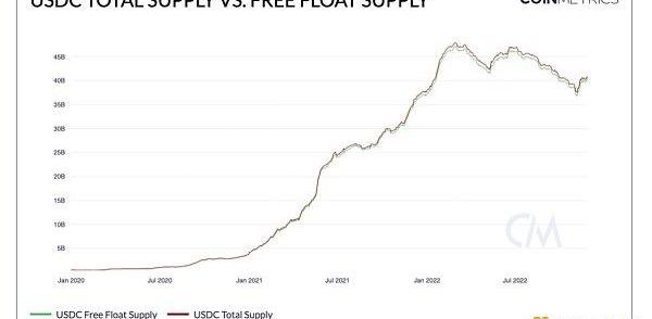 同时,另一个由法币支持的稳定币中坚力量USDC,自11月8日以来经历了自由浮动供应的轻微上升,从370亿美元上升到400亿美元。