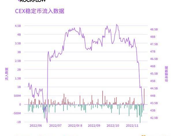 稳定货币也在遭遇同样趋势的流出。CEX内的稳定币从11月初近475亿美元到11月19日降至430.7亿美元,流失占比达到9.3%。