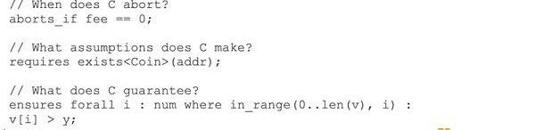 规范语言是Move的一个集成部分。规范被分离成specblock。specblock指定了函数的前置条件和后置条件。