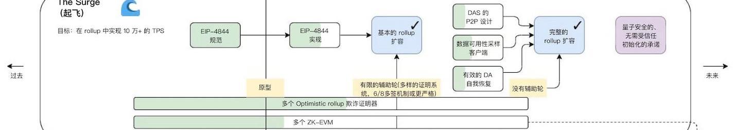该路线的主要目标是推动以Rollup为中心的扩容。Surge指的是添加了以太坊分片,这是一种扩容解决方案,以太坊基金会声称:该解决方案将进一步启用低gas费的二层区块链,降低rollup或捆绑交易的成本,并使用户更容易操作保护以太坊网络的节点。