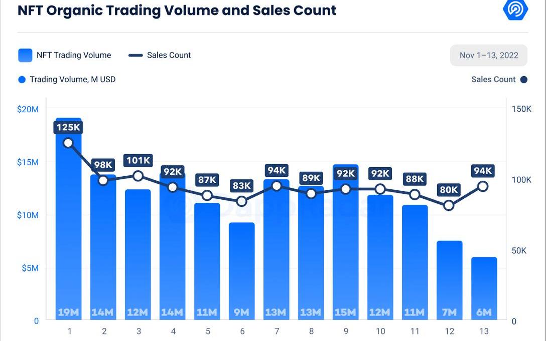 NFT市场远未消亡,其当前交易量的下降是由于社会经济因素,而不是用户兴趣的下降,因为这两周的销售量仅下降了24.50%。