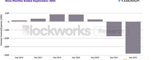 虽然上述对Microstrategy及其BTC储备的风险相对来说还没有成为直接的担忧,但更大的担忧在于该公司对其未偿债务的利息的偿还能力。在承担超过23.7亿美元的债务之前,Microstrategy在其业务中赚取利息。然而,现在的情况是用于偿还债务的利息支出带来的现金净流出。在截至2022年9月30日的季度里,Microstrategy产生了超过3800万美元的利息支出,如下图所示。