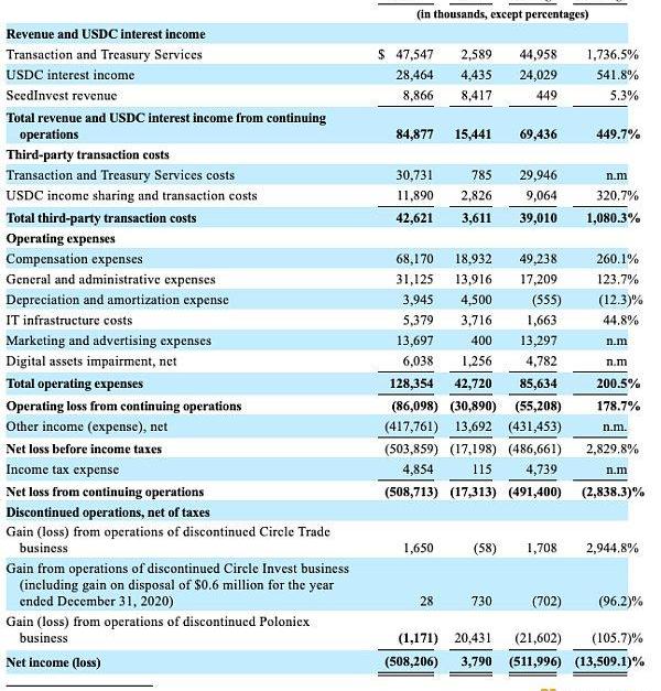 据今年5月Circle向SEC提交的招股书显示:Circle在2021年产生8487.7万美元的收入,其中有4754.7万美元来自TTS,2846.4万美元来自USDC,886.6万美元来自SeedInvest,分别较2020年上升了1736.5%、541.8%、5.3%。