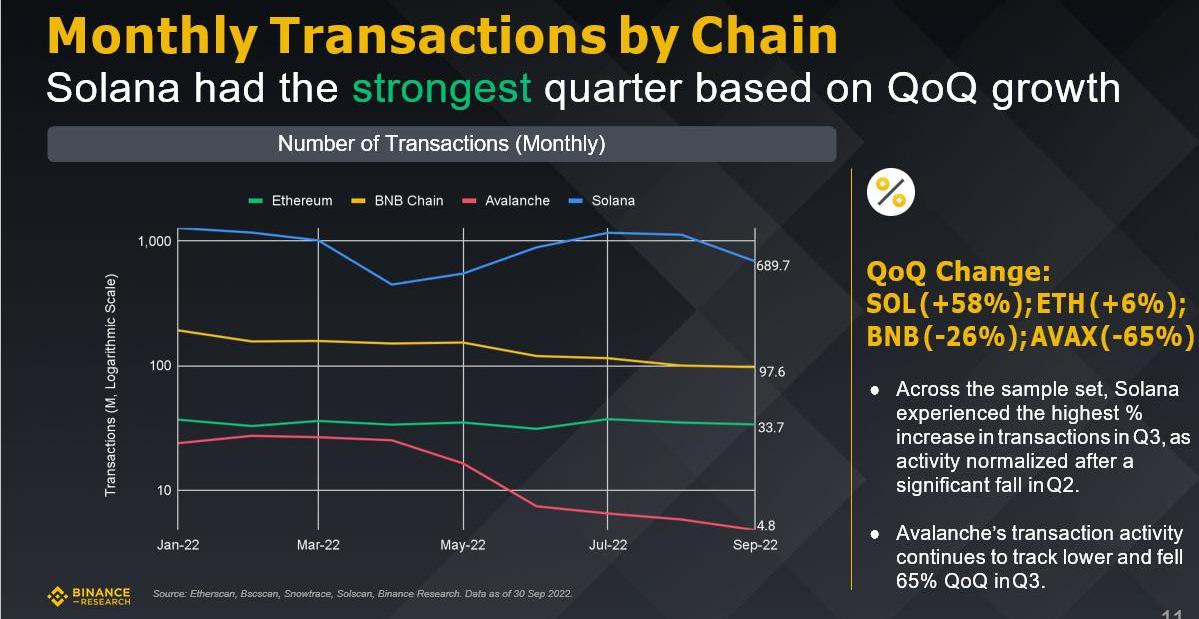 根据截至2022年9月30日Etherscan、Bscscan、Snowtrace、Solscan和BinanceResearch数据,按照区块链月交易量,Solana的季度表现最为强劲。