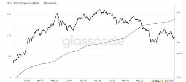 当验证者进入网络时,每个验证者必须存入至少32个ETH。质押的总价值反映所有质押存款的总和,见下文。