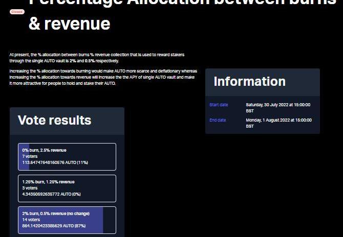 Auto是Autofarm的原生治理?token。它用于投票决定将被烧毁或作为收入分配给将其放入?AutoVault?上的Auto持有者的Auto数量。该投票是每月举行一次。