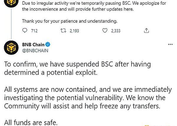 BNBChain发推表示,由于活动异常,目前正在维护中,暂时暂停所有通过BNB链的存取款,直到有进一步的更新。“我们在确定潜在漏洞后暂停了BNBChain,所有系统现在都被控制住了,我们正在调查潜在的漏洞,我们知道共同体将协助并帮助冻结任何转账”。BNBChain在另一推文表示,被提取资金约7000万至8000万美元,已冻结700万美元。据悉,本次黑客攻击导致包含200万枚BNB在内的约价值7.18亿美元资产被盗取。