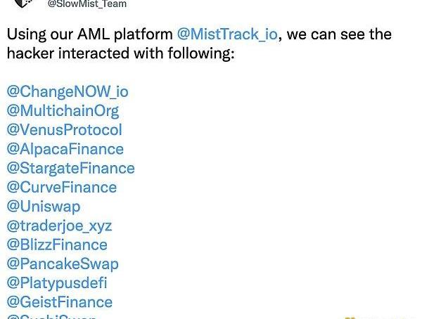 慢雾SlowMist在社交媒体上发文表示,已监控到本次BNBChain被盗案黑客地址与多个dApp进行过交互,包括Multichain、VenusProtocol、AlpacaFinance、Stargate、Curve、Uniswap、TraderJoe、PancakeSwap、SushiSwap等。