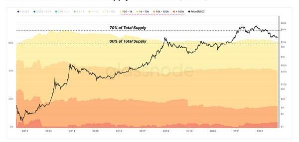大型主体的重要性可以通过它们在总流通供应中所占的份额来衡量。正如相对地址供应分布图所示,自2011年初以来,较大的主体在总供应量中的份额从70%逐渐下降至60%。