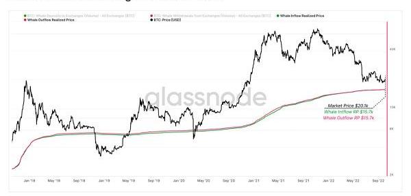 我们可以计算所有在特定时间段内积极投机的鲸鱼的基础成本,从而得出一个影响这些投资者心理的阈值水平。通过探索鲸鱼队列进出交易平台的存款和取款量,我们估算出自2017年1月以来鲸鱼存款/取款的平均价格。这个鲸鱼基础成本目前约为1.58万美元。