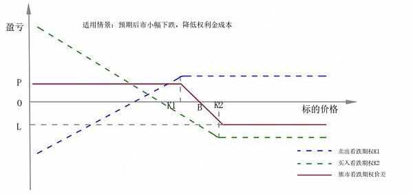 当标的资产价格下跌,熊市看跌期权价差倾向于能够获利。因为低价call比高价call要贵,当标的资产价格超过较高执行价格,这一价差通常会产生最大的亏损。如果两个期权都变成价外、价值归零,那么投资者为这个价差所支付的净费用将全部损失。这个价差的最大利润通常发生在标的资产价格低于较低执行价格之时,这样两个期权都会以“价内”方式到期。投资者可以执行买入的看跌期权,以较高的执行价格卖出标的,然后在较低执行价格期权被执行时卖出标的。