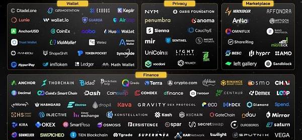 来显示整个生态有多么庞大,但是这些图片都太过“大而全”,一般用户是不可能把上面所有项目都看一遍的,所以我们就挑下最重点的几个赛道和项目,来介绍下Cosmos的主要生态。