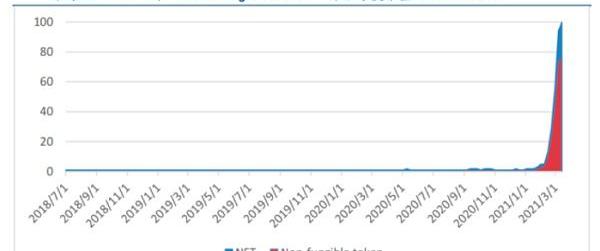 自2020年9月以来,NFT的销售数量大幅增加,并一直保持高水平增长。某个新奇的物品,正在慢慢走入少数人的社交媒体。从2021年2月开始,NFT开始爆炸式增长,每周交易量超过200万美元,并在数月的时间里,大型NFT项目的总市值增长高达2000%。
