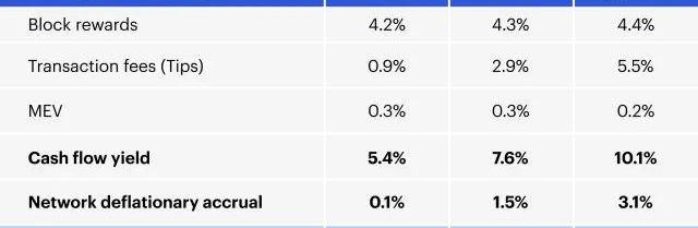向PoS的过渡为机构创造了引人注目的奖励机会。随着ETH鲸鱼——包括加密交易所、基金和托管人——已经认识到持有ETH在DeFi世界具有强大地位,他们已经能够在其ETH头寸上获得4.06%的年化收益率。合并后,我们预计ETH定投的实际收益率将在5.5%至13.2%之间,这取决于几个因素,如区块奖励、交易费用和验证者累积的最大可提取价值。