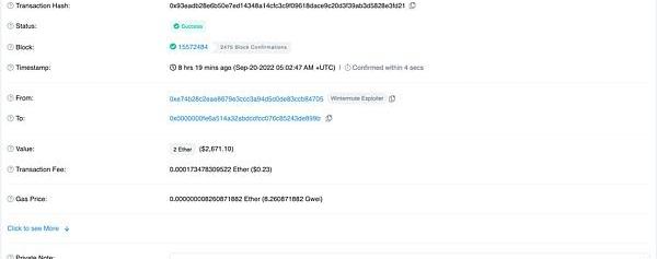 让我们回到这次事件当中来。首先,一个外部账户EOA0x6AE09在9月20日创建了一个恶意合约,并在下面的交易中向0x0000000fE6A514a32aBDCDfcc076C85243De899b转移2个ETH。