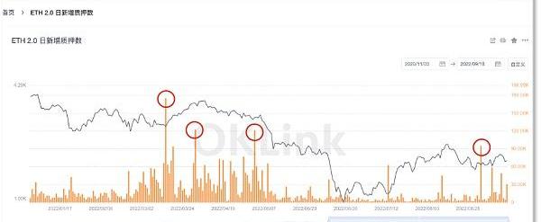 丹尼尔提到的数据是以太坊信标链上质押ETH的变化,它是以太坊转向PoS机制后,网络验证人的数据反馈。欧科云链旗下区块链链上数据分析平台,区块链浏览器OKLink显示,9月1日,ETH2.0日新增质押数达到了94997ETH,顶起了今年ETH质押的第四次高峰,9月15日前,质押活跃度较前三个月有所提升。