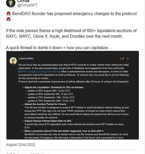 8月23日,BendDAO通过了紧急参数更新,从9月20日起将清算门槛从95%逐步降低到新的最终基线70%。该DAO还同意将出价锁定期从48小时下调至4小时。