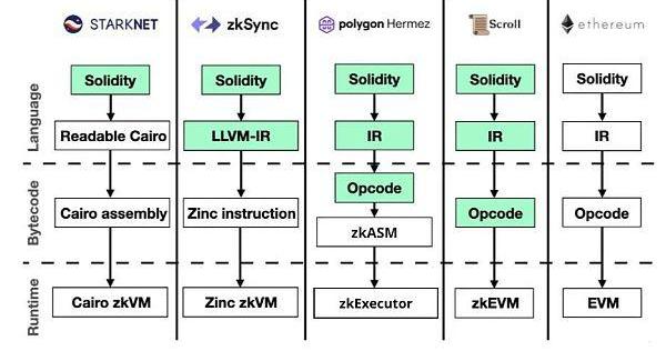 另一个采用这种策略的团队是zkSync。zkSync创建了自己的VM(SyncVM),它是基于寄存器的,并定义了自己的代数中间表示(AIR)。然后,他们构建了一个专门的编译器,将Yul(一种中间语言,可以编译成针对不同EVM版本的字节码,比如较低级别的Solidity)编译成LLVM-IR,然后再将LLVM-IR编译成用于自定义VM的指令。这类似于StarkWare所采取的方法,但它们在基础语言上提供了更多的灵活性。zkSync团队最初创建了他们自己的类似于Cairo的语言(Zinc),但是他们将主要精力集中在了Solidity编译器上,以便L1开发人员能够更简单地进行迁移。