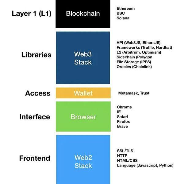 Web3堆栈由创建dApp的构建模块组成,这些dApp将用户连接到区块链上的数字资产(如以太坊、币安智能链、Solana)。有很多不同的类别,从文件存储,索引,查询,链下(第2层或L2)协议,开发框架,身份(如钱包)和预言机等等。这些可以用API,开发人员可以使用这些API调用例程和方法来访问区块链。