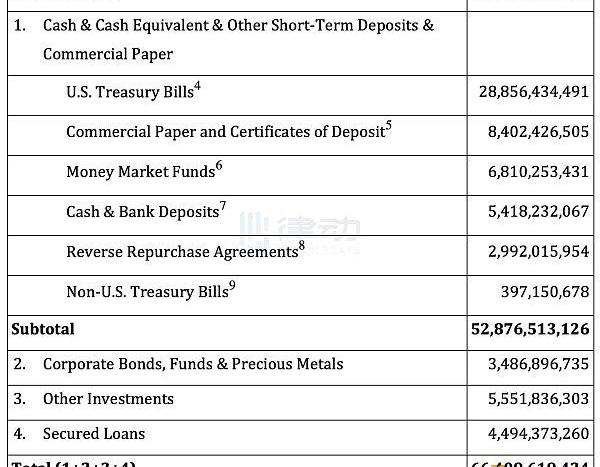 在之后的审查报告里,Tether账面上多了一些其他的占比不多的项目,例如货币市场基金、其他国家国债,等。Tether同时逐步减少了现金的占比,自2021年12月31日的审查报告后大大提升了美国国债的持有。此前,美国国债的占比约25%左右,之后美国国债占比约45%左右。