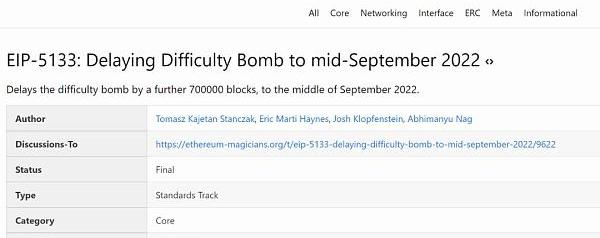 在最近一次的难度炸弹推迟EIP-5133提案中,难度炸弹被推迟到了2022年9月中旬。