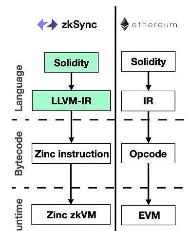 另一个采用这种策略的团队是zkSync。zkSync创建了自己的VM(SyncVM),它基于寄存器并定义了自己的代数中间表示(AIR)。然后他们构建了一个专门的编译器来将Yul编译成LLVM-IR,然后他们将其编译成自定义VM的指令。这类似于StarkWare采用的方法,但理论上提供了围绕基础语言的更大灵活性。zkSync团队最初创建了他们自己的类CAIRO语言(Zinc),但他们将大部分精力集中在Solidity编译器上,以便为L1开发人员提供更简单的迁移。一般来说,他们的策略是重用以太坊工具集而不是StarkNet——我希望他们的客户端API等也更加“与以太坊兼容”。