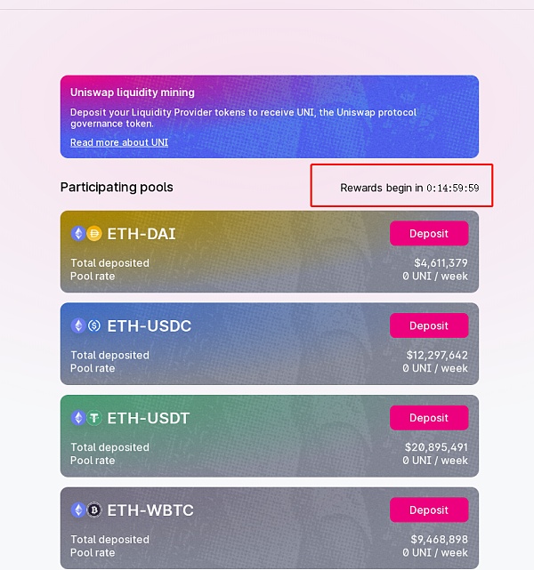 简单翻译为:2020年9月18日20:00开始,持续到2020年11月17日20:00,将支持Uniswap v2上的四个池:ETH/USDT、ETH/USDC、ETH/DAI、ETH/WBTC。每个池将按流动性比例向LP分配5000000UNI,大致相当于:每天每个池83333.33 UNI,每个区块每个池54个UNI。