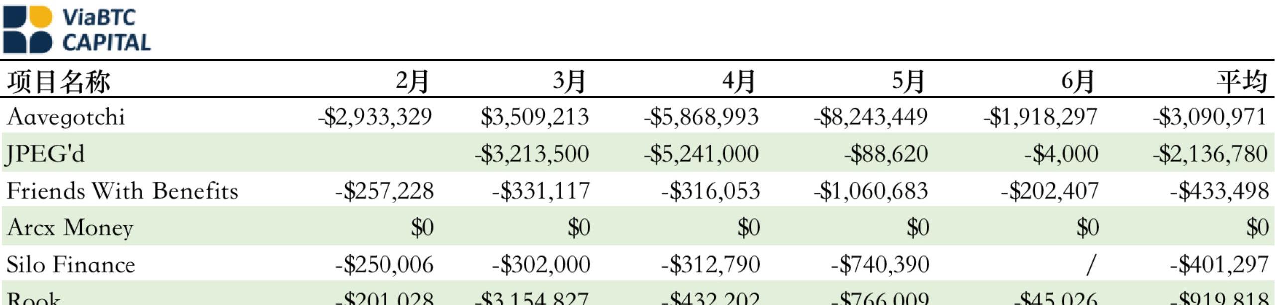 下图有一些有趣的结论,比如Arcx的金库从2月起,已经没有支出了,疑似项目方没做事了,也有可能有别的未公开金库或链下支付运营支出。其他项目,除了JPEG上线初期,支出较不平稳,别的项目流水都比较稳定。