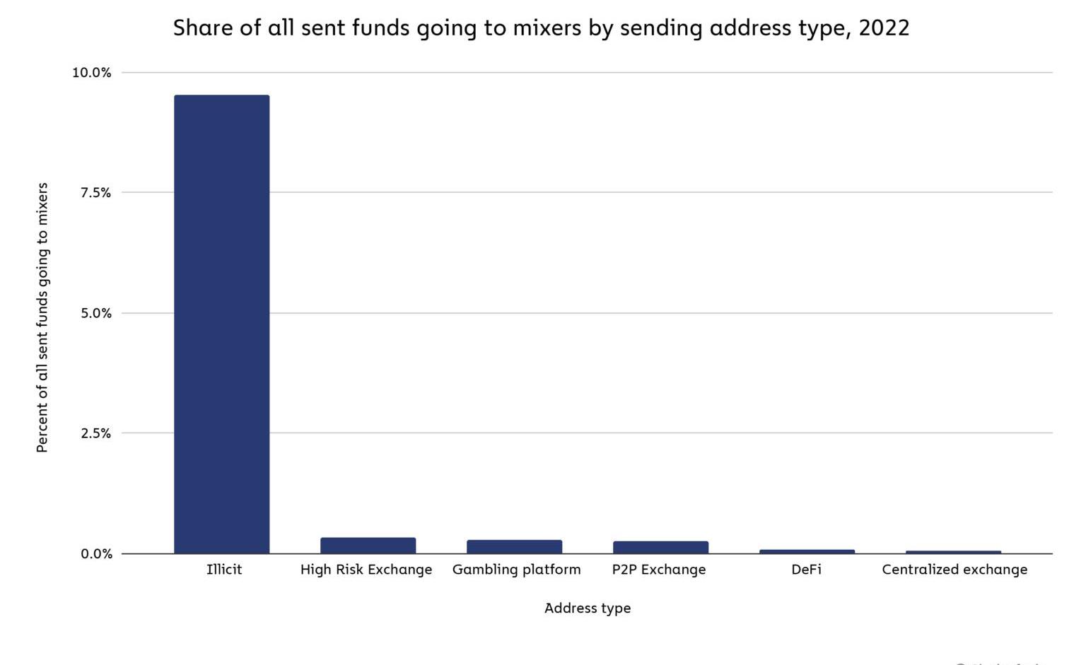 必须承认,混币器的核心定位和功能,以及其很少要求KYC的特性,使它们自然而然地成为了网络罪犯的首选。根据Chainalysis的数据显示,从非法地址发送的资金中,有近10%是被转到了TornadoCash这样的混币器中,而转到中心化交易平台、DeFi这些「主流基建」的资金甚至都没有超过0.5%。