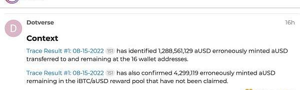 这种错误配置导致了aUSD的错误铸币,这些铸币币在许多iBTC/aUSDLP贡献者领取iBTC/aUSDLP奖励时被转移到他们的钱包地址。此后,错误配置已得到纠正,收到错误铸造的aUSD的钱包地址已被识别,对这些地址的链上活动跟踪正在进行中。