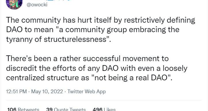 Gitcoin的KevinOwocki在一个Twitter串推上讨论了这个问题,他指出,去中心化可以指「通过无需许可的代币进行去中心化治理」,而不是「混乱的个体松散网络」。