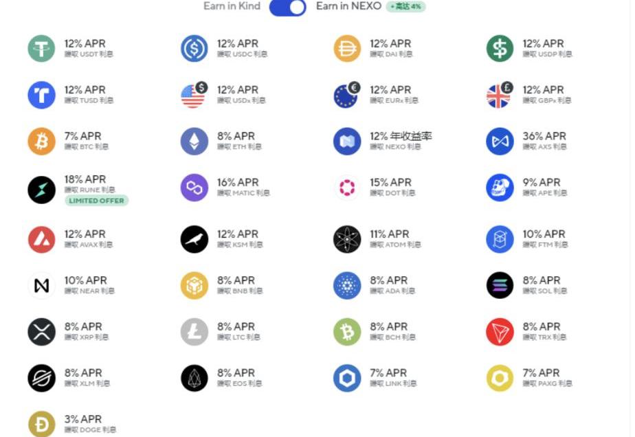 用户可以选择定期,也可以选择活期。定期存单可以在LTV不足时成为额外抵押品。利息可以以存款币种来发放,也可以以平台代币来发放,二者之间可以任意切换。如果用户选择以平台代币作为利息收益,平台会提供额外的利息收益作为激励。用户可以随时存或者赎回产品。一般来说类似平台都会通过高收益率来吸引客户。此图截取于2022年7月4日,虽然已经发生了众多平台的暴雷,NEXO仍然将这种高收益噱头放在其官网上。