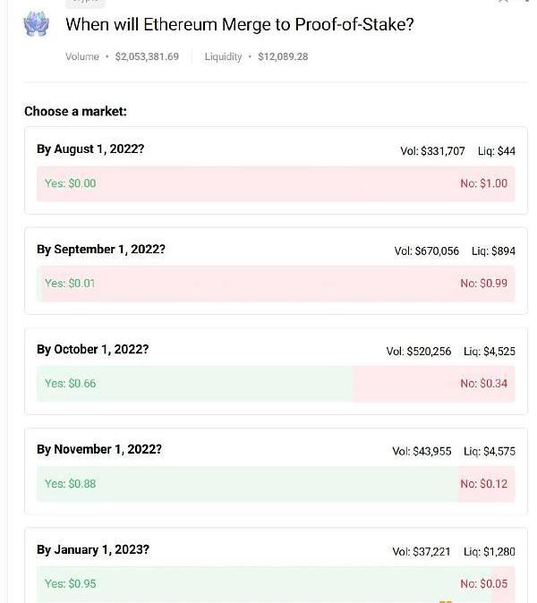 Polymarket拥有最大的合并预测市场。尽管流动性低得令人难以置信,削弱了它的预测能力,但它提供了另一种更简单的方式来衡量市场对合并的情绪。