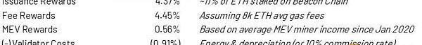 当然,这样的收益率是不可持续的。因此,我们预计合并后质押的ETH将显着增加。如果质押占总ETH的比例与替代性的L1相当(Solana和Tezos:75%,Cosmos:64%,NEAR:39%),那么以太坊质押收益率将压缩到年利率2%以下。