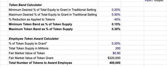 你可以使用这个计算公式,根据你研究的传统股权百分比确定你的代币百分比,以及在你想授予多少个百分比的情况下授予员工的代币数量。