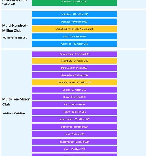 第一档:?Ethereum和Opensea,Ethereum的半年总收入为4.6billionUSD,在榜单中遥遥领先;Opensea的半年总收入约为1.8billionUSD,也是一个疯狂的现金奶牛;