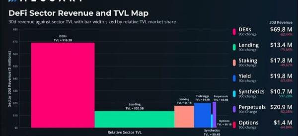 相对较低的使用波动性和相对较高的TVL使DEX在过去一个月中产生的收入占据了DeFi总收入的绝大部分。尽管7,000万美元的收入比过去三个月下降了62%,但仍几乎与所有其他板块的月收入总和(8,400万美元)相差无几。鉴于阴云密布的宏观经济背景,随着交易者不断减少杠杆,DEX可能会继续在DeFi收入中占据最大份额。