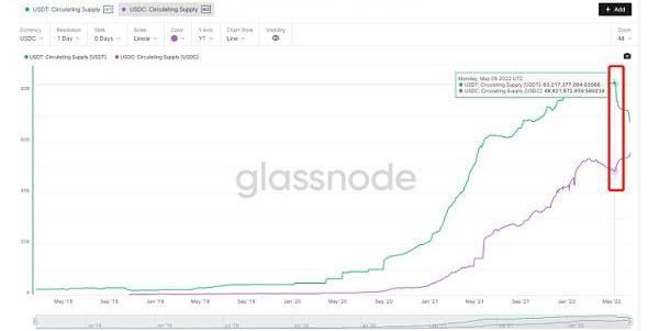 恐慌使持币者将手中的USDT兑换为其他稳定币或美元现货,一度给USDT造成较大抛压。据CoinMarketCap行情数据显示,USDT在5月12日最低下跌至0.9485美元,脱锚超5%。Tether的市值也一度下跌9%至760亿美元,因为代币已从流通中销毁,以满足用户的赎回请求。