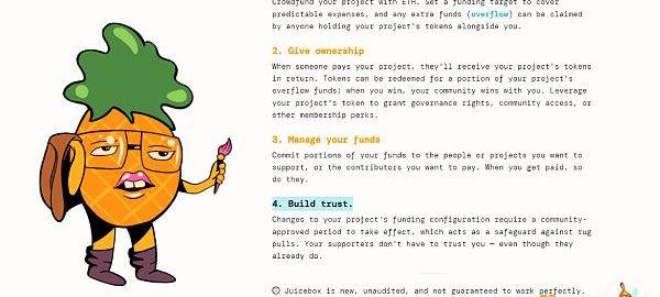 “因其公共性,任何对合约的利用都可能导致不可逆转的后果,包括资金的损失。请谨慎使用Juicebox。每个项目有其自身法律和结构性风险。”