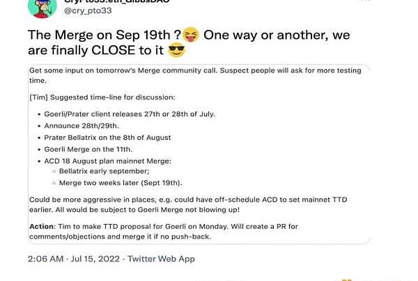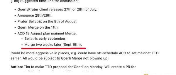 Merge完成的时间点是个重要变量。我作为一个非技术背景的投资人尝试从公开信息中抽丝剥茧得出有价值的信息。我的初步结论是将发生在9月底-10月底的这个时间窗口,供大家参考,也希望得到反馈。