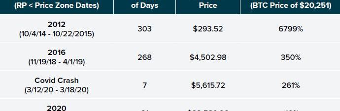 截至2022年6月13日,比特币的已实现价格低于市场价格,表明我们可能正式进入熊市。以正常模式,一些人认为,市场周期中的这些点可能代表最好的购买机会。下表显示了比特币的平均价格在已实现价格<比特币市场价格的区域内。